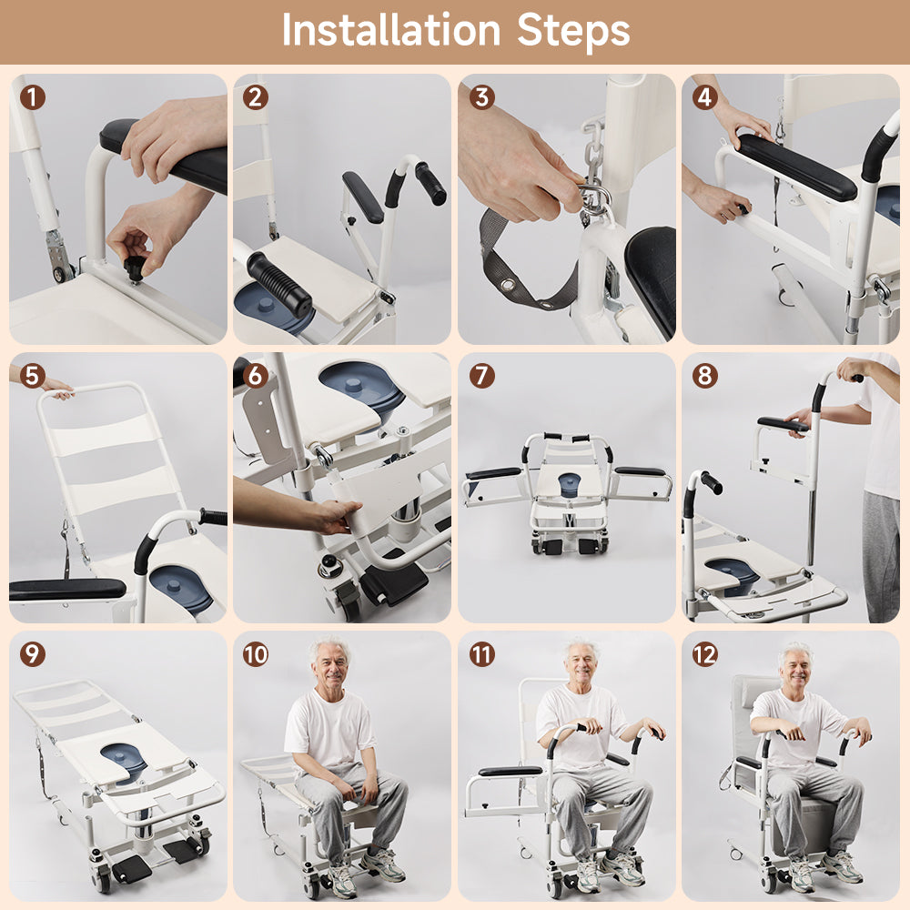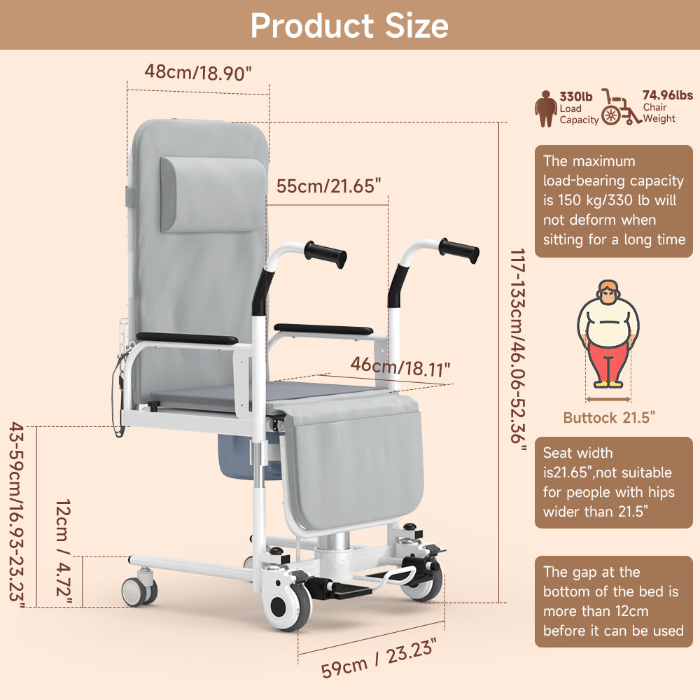 This 4‑in‑1 Patient Transfer Lift Wheelchair functions as a wheelchair, shower chair, commode chair, and nursing‑bed mode. It features hydraulic height adjustment, 360° casters with dual front/rear locks, a 90° flip seat for safer transfers, and a water‑ready frame that’s easy to clean. Max load 150 kg (330 lb); recommended safe use ≤ 120 kg (264 lb). Verify doorway width, under‑bed clearance, and bed height before purchase to ensure a smooth fit.