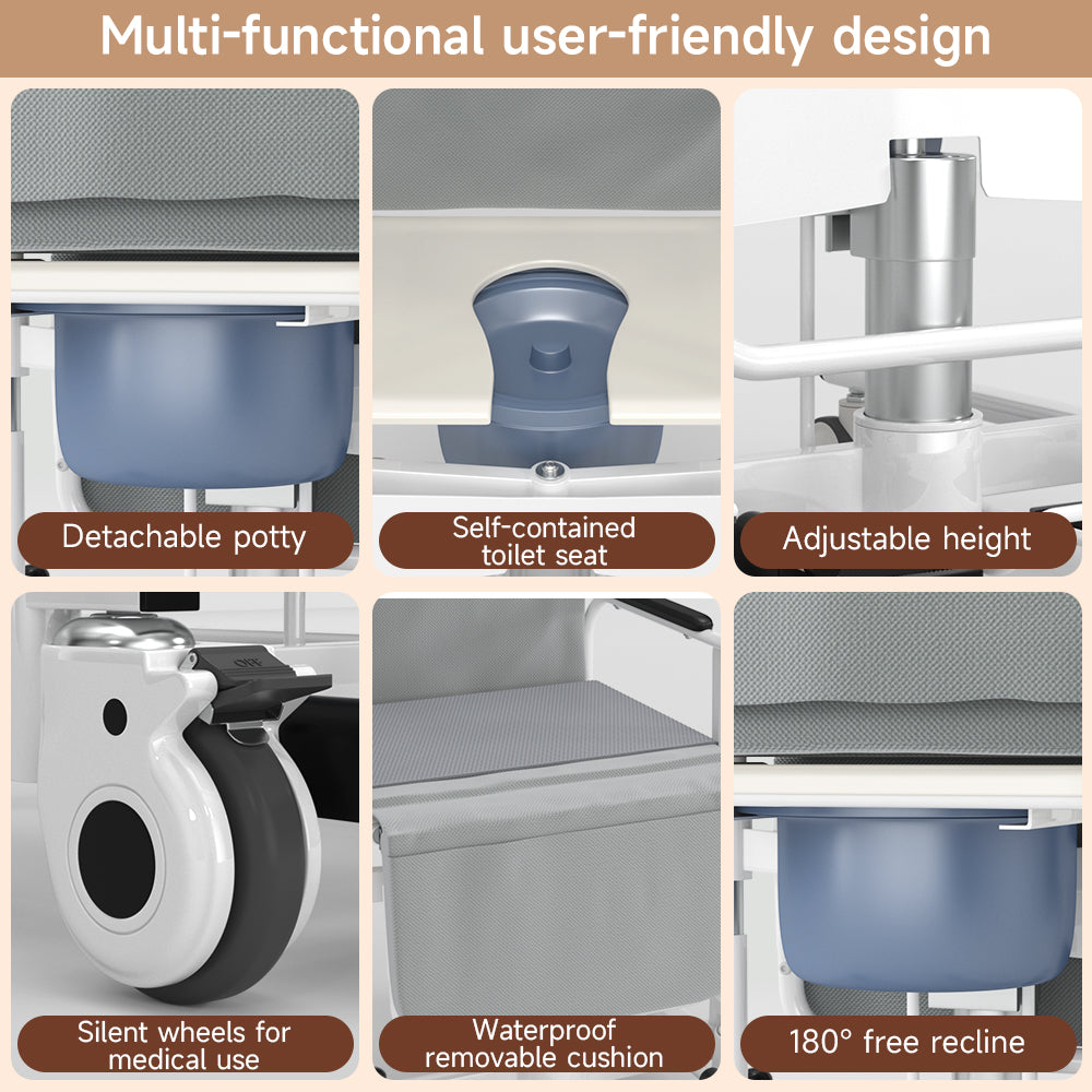 | Functions | 4‑in‑1: Transfer chair / Wheelchair / Shower chair / Nursing‑bed mode |